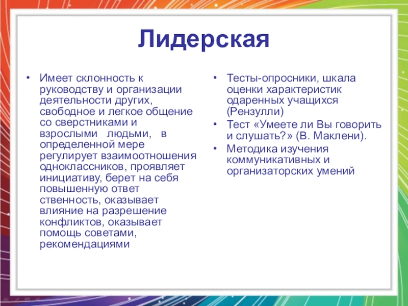 легкое общение со сверстниками и взрослыми людьми, в определенной мере регулирует взаимоотношения одноклассников, проявляет инициативу, берет на себя повышенную ответственность, оказывает влияние на разрешение конфликтов, оказывает помощь советами, рекомендациями