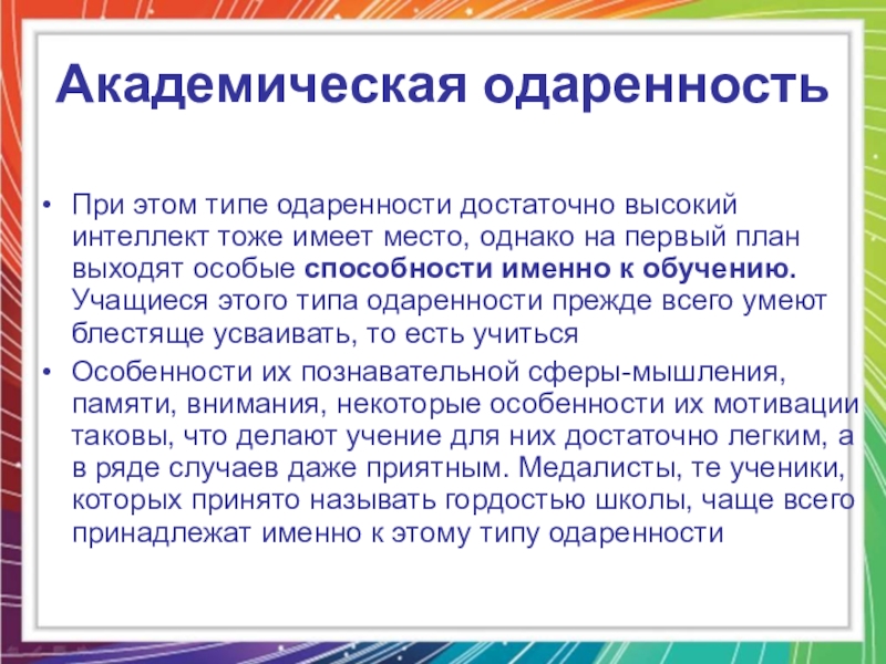 Особенности их познавательной сферы-мышления, памяти, внимания, некоторые особенности их мотивации таковы, что делают учение для них достаточно легким, а в ряде случаев даже приятным. Медалисты, те ученики, которых принято называть гордостью школы, чаще всего принадлежат именно к этому типу одаренности