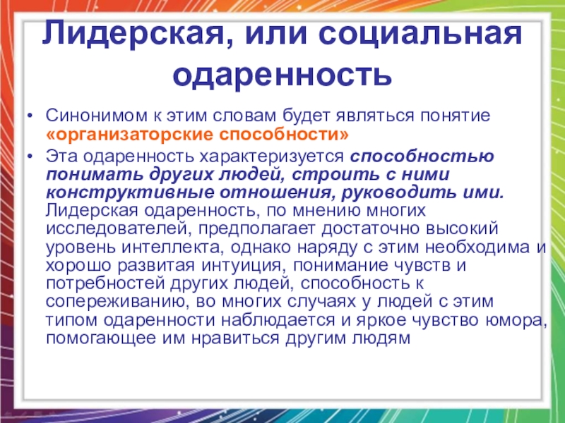 Эта одаренность характеризуется способностью понимать других людей, строить с ними конструктивные отношения, руководить ими. Лидерская одаренность, по мнению многих исследователей, предполагает достаточно высокий уровень интеллекта, однако наряду с этим необходима и хорошо развитая интуиция, понимание чувств и потребностей других людей, способность к сопереживанию, во многих случаях у людей с этим типом одаренности наблюдается и яркое чувство юмора, помогающее им нравиться другим людям