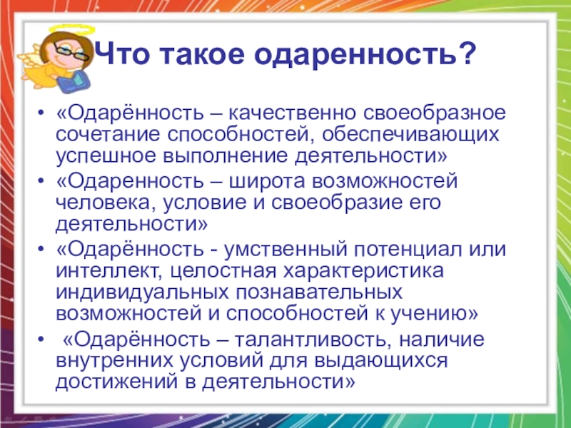 «Одарённость - умственный потенциал или интеллект, целостная характеристика индивидуальных познавательных возможностей и способностей к учению»