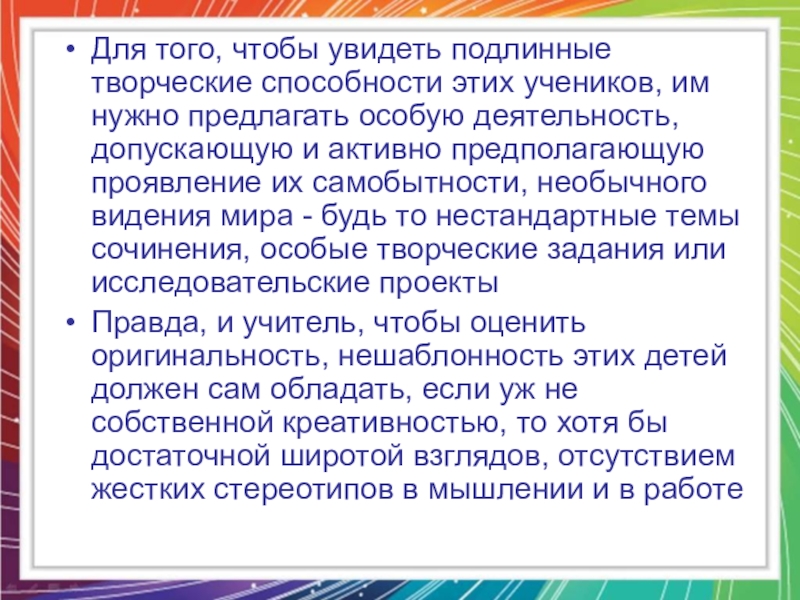 Правда, и учитель, чтобы оценить оригинальность, нешаблонность этих детей должен сам обладать, если уж не собственной креативностью, то хотя бы достаточной широтой взглядов, отсутствием жестких стереотипов в мышлении и в работе