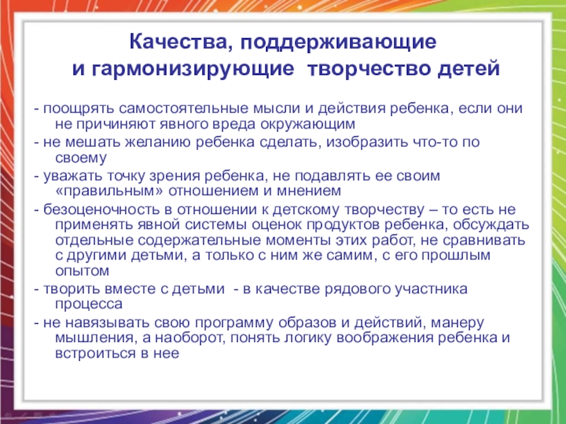 - безоценочность в отношении к детскому творчеству – то есть не применять явной системы оценок продуктов ребенка, обсуждать отдельные содержательные моменты этих работ, не сравнивать с другими детьми, а только с ним же самим, с его прошлым опытом