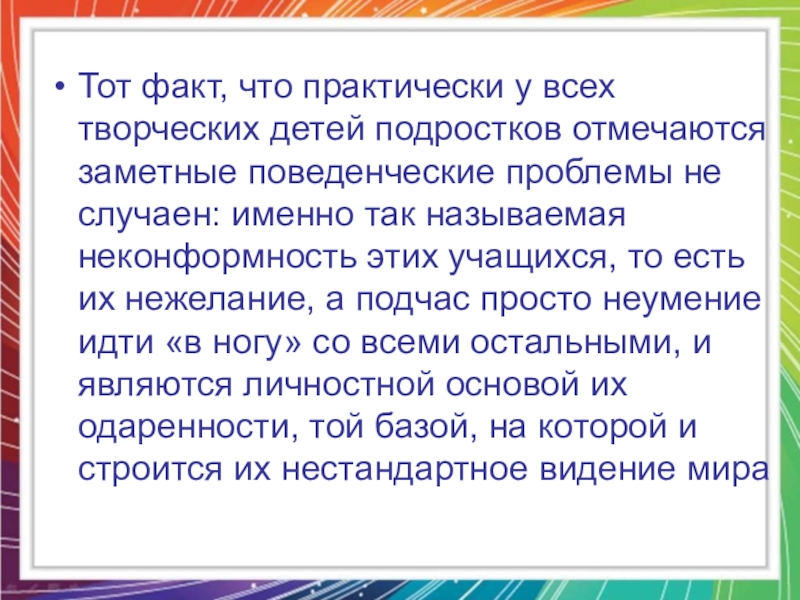 поведенческие проблемы не случаен: именно так называемая неконформность этих учащихся, то есть их нежелание, а подчас просто неумение идти «в ногу» со всеми остальными, и являются личностной основой их одаренности, той базой, на которой и строится их нестандартное видение мира