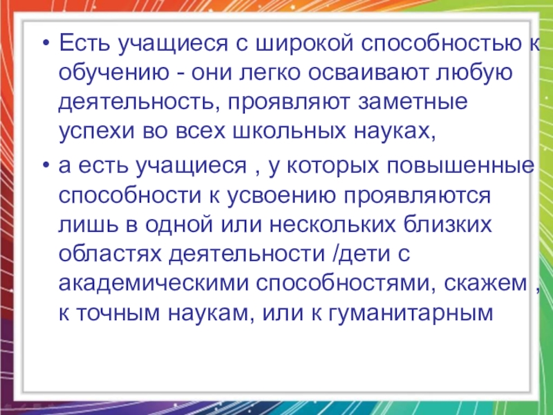 а есть учащиеся , у которых повышенные способности к усвоению проявляются лишь в одной или нескольких близких областях деятельности /дети с академическими способностями, скажем , к точным наукам, или к гуманитарным