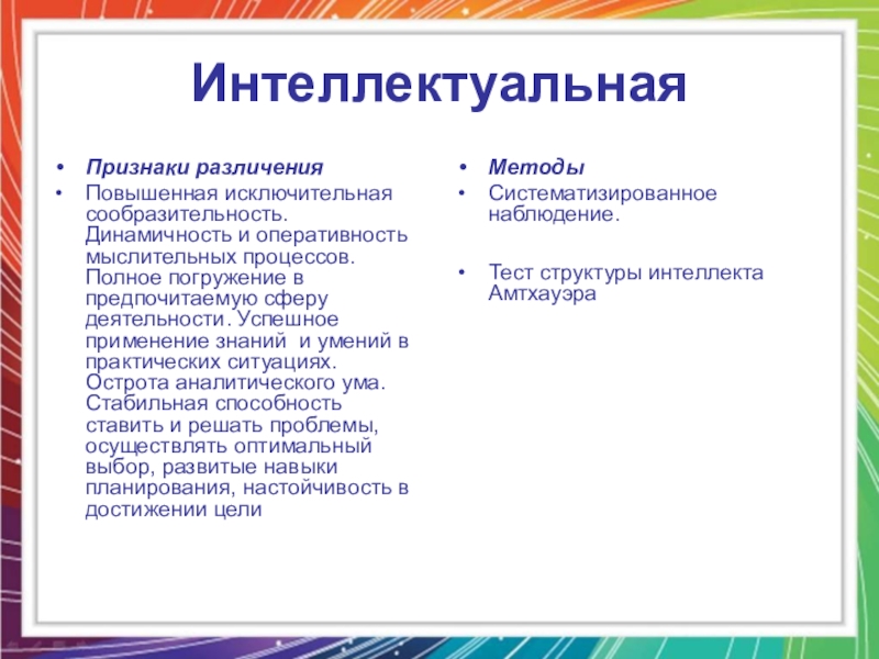 Повышенная исключительная сообразительность. Динамичность и оперативность мыслительных процессов. Полное