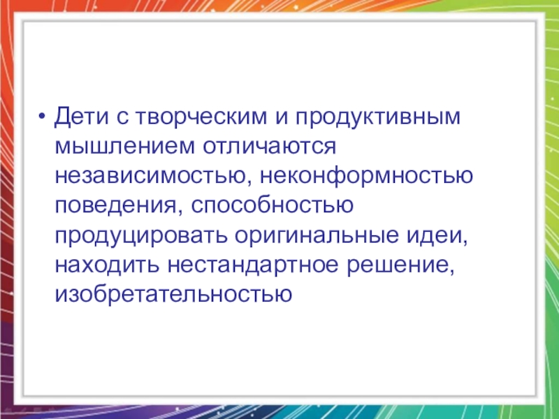 Дети с творческим и продуктивным мышлением отличаются независимостью, неконформностью поведения, способностью