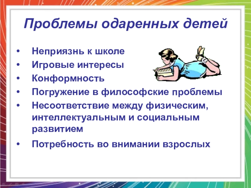 Многие ученики с этими способностями не имеют достаточной школьной мотивации и, обладая сильным характером и независимостью, откровенно ничего не делают в школе