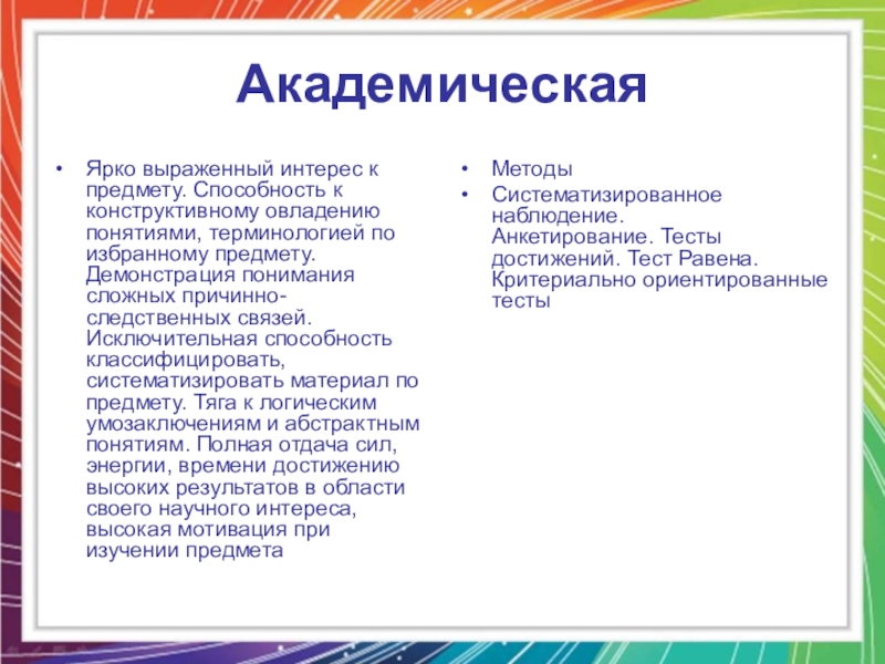 Ярко выраженный интерес к предмету. Способность к конструктивному овладению понятиями,