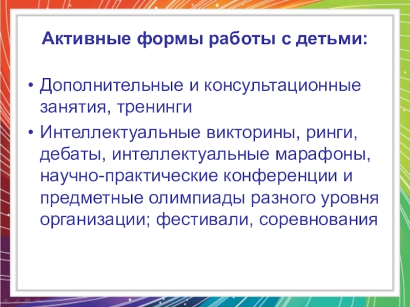 Интеллектуальные викторины, ринги, дебаты, интеллектуальные марафоны, научно-практические конференции и предметные олимпиады разного уровня организации; фестивали, соревнования. Считаем, что важно стимулировать социальные достижения, проявление доброты, щедрости, терпения, что позволяет ребёнку избавиться от собственной исключительности, а родителям - от «эксплуатации» детской одарённости