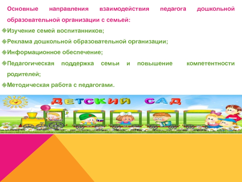 Слайд 5Основные направления взаимодействия педагога дошкольной образовательной организации с семьей: