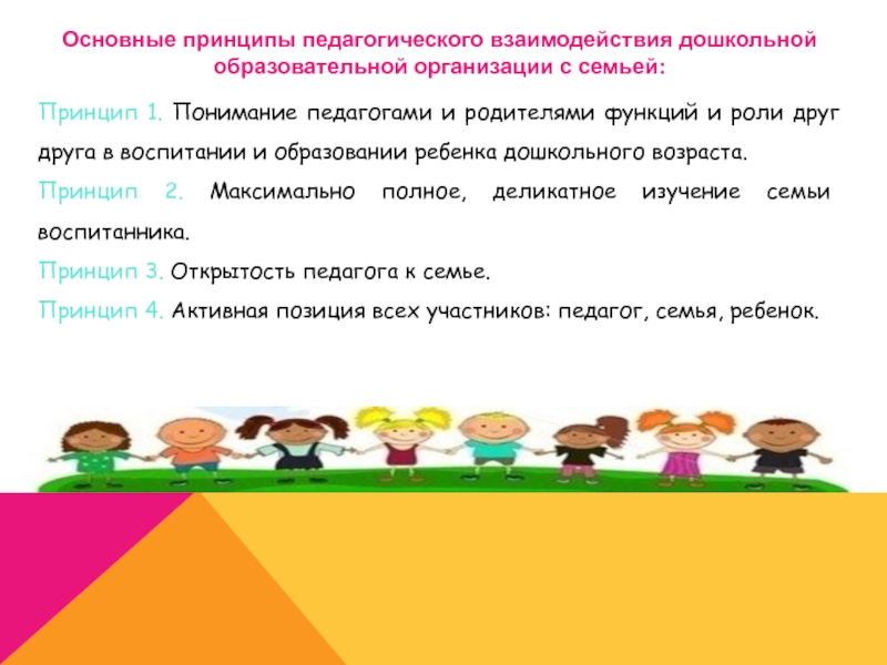 Слайд 4Основные принципы педагогического взаимодействия дошкольной образовательной организации с семьей:
