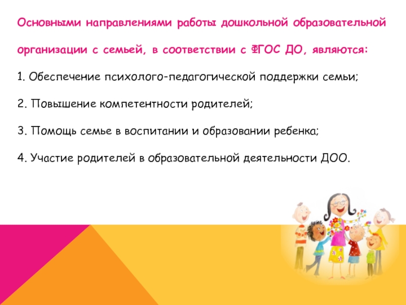 Слайд 3Основными направлениями работы дошкольной образовательной организации с семьей, в соответствии с
