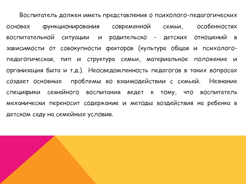 функционирования современной семьи, особенностях воспитательной ситуации и родительско - детских отношений в зависимости от совокупности факторов (культура общая и психолого-педагогическая, тип и структура семьи, материальное положение и организация быта и т.д.). Неосведомленность педагогов в таких вопросах создает основные проблемы во взаимодействии с семьей. Незнание специфики семейного воспитания ведет к тому, что воспитатель механически переносит содержание и методы воздействия на ребенка в детском саду на семейные условия.