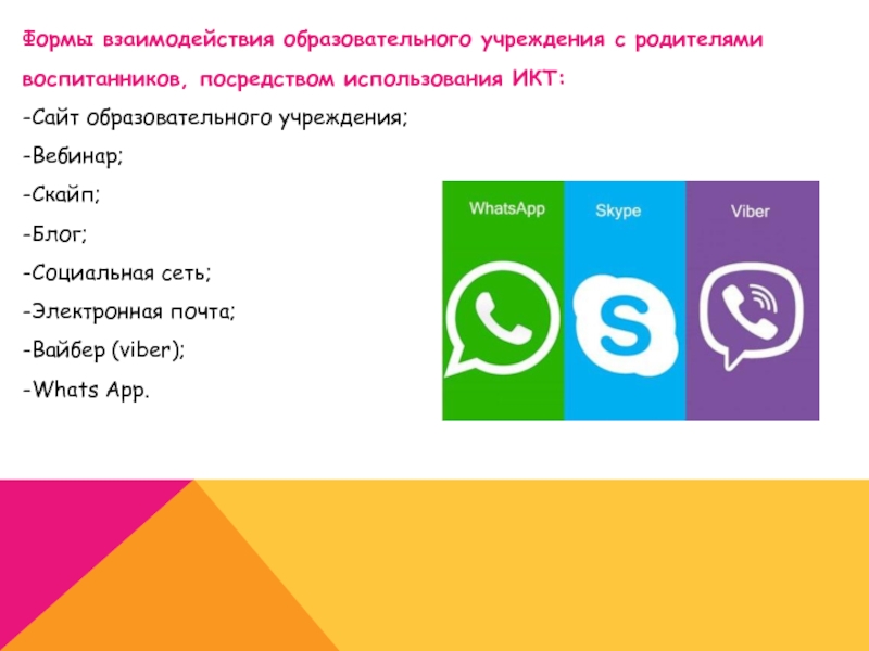 Слайд 15Формы взаимодействия образовательного учреждения с родителями воспитанников, посредством использования ИКТ: