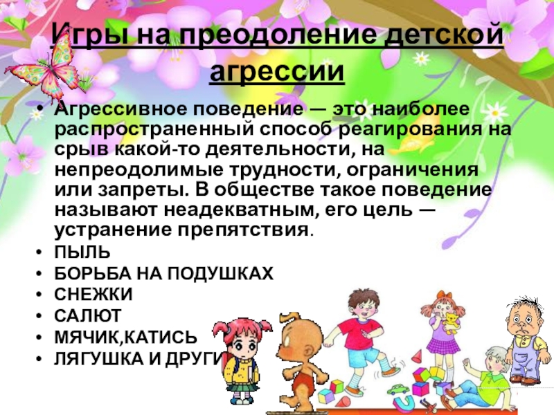 Слайд 3Игры на преодоление детской агрессии