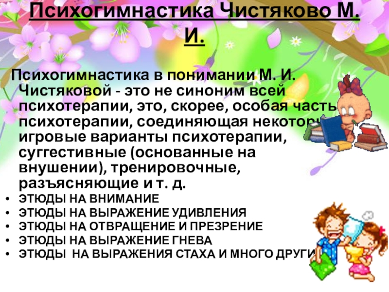 Психогимнастика Чистяково М.И.     Психогимнастика в понимании М. И. Чистяковой - это не синоним всей психотерапии,