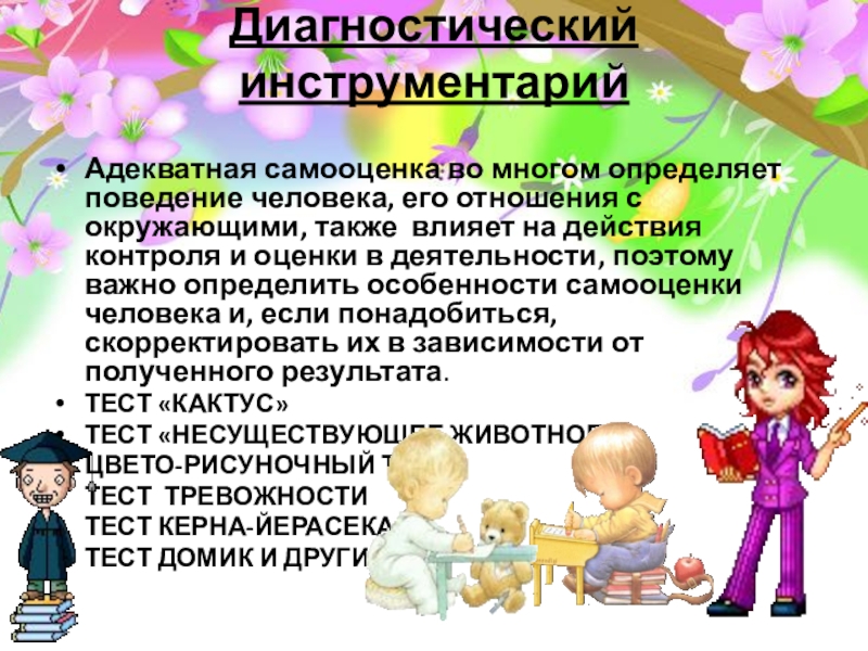 Диагностический инструментарий Адекватная самооценка во многом определяет поведение человека, его отношения с окружающими, также  влияет на действия