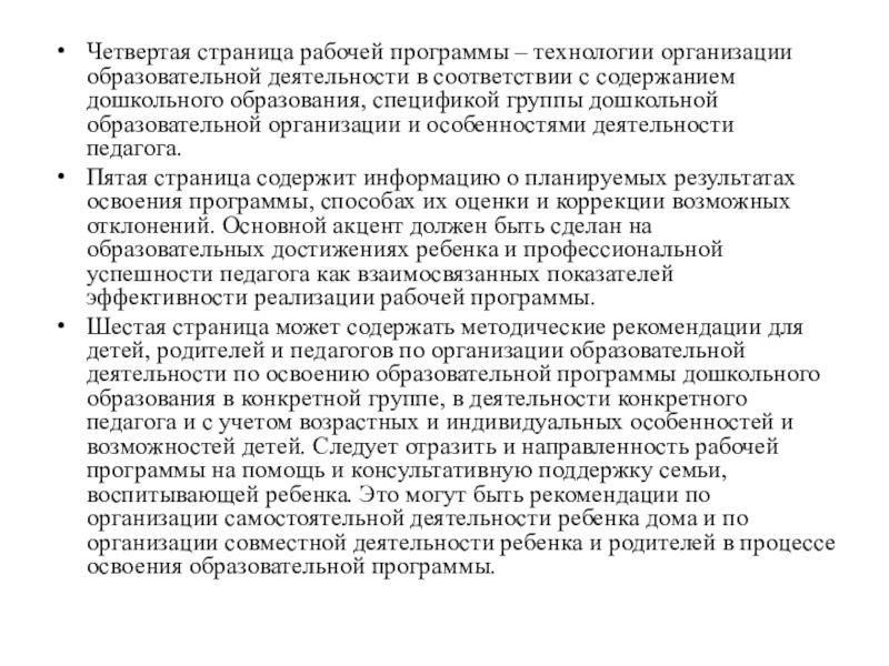 Шестая страница может содержать методические рекомендации для детей, родителей и педагогов по организации образовательной деятельности по освоению образовательной программы дошкольного образования в конкретной группе, в деятельности конкретного педагога и с учетом возрастных и индивидуальных особенностей и возможностей детей. Следует отразить и направленность рабочей программы на помощь и консультативную поддержку семьи, воспитывающей ребенка. Это могут быть рекомендации по организации самостоятельной деятельности ребенка дома и по организации совместной деятельности ребенка и родителей в процессе освоения образовательной программы.