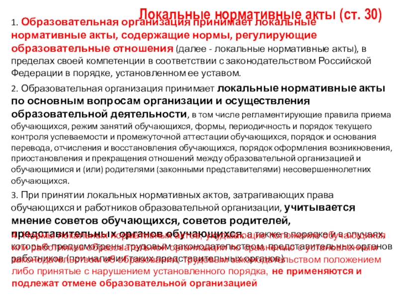 Слайд 91. Образовательная организация принимает локальные нормативные акты, содержащие нормы, регулирующие образовательные
