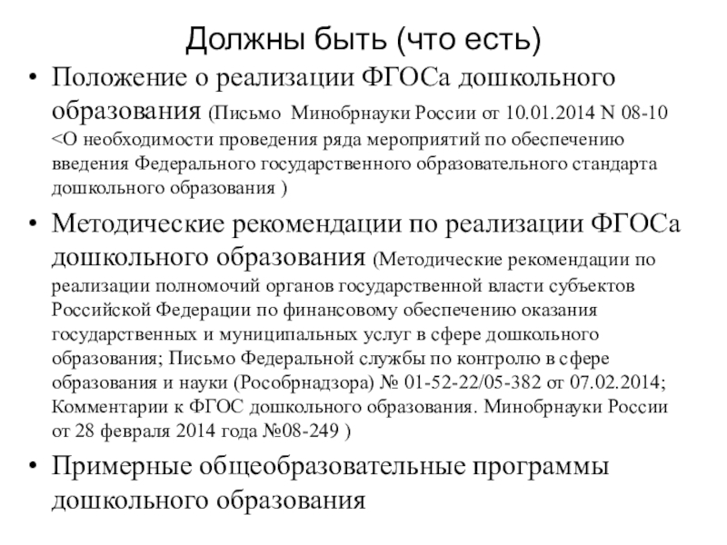 России от 10.01.2014 N 08-10 <О необходимости проведения ряда мероприятий по обеспечению введения Федерального государственного образовательного стандарта дошкольного образования )