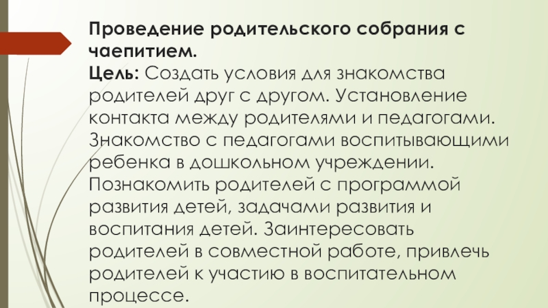 друг с другом. Установление контакта между родителями и педагогами. Знакомство с педагогами воспитывающими ребенка в дошкольном учреждении. Познакомить родителей с программой развития детей, задачами развития и воспитания детей. Заинтересовать родителей в совместной работе, привлечь родителей к участию в воспитательном процессе.