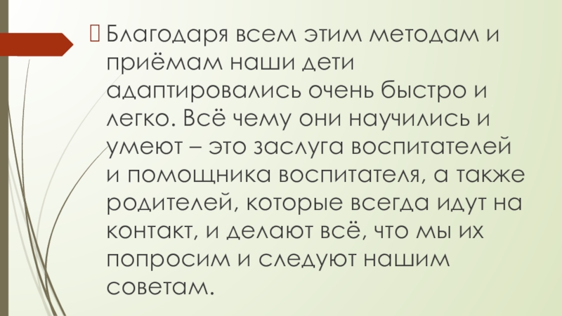 Слайд 24Благодаря всем этим методам и приёмам наши дети адаптировались очень быстро
