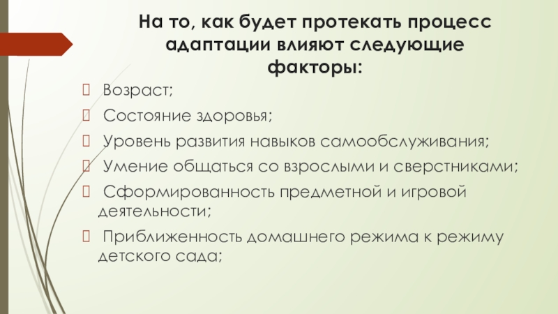 Слайд 7На то, как будет протекать процесс адаптации влияют следующие факторы: