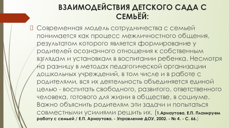 процесс межличностного общения, результатом которого является формирование у родителей осознанного отношения к собственным взглядам и установкам в воспитании ребенка. Несмотря на разницу в методах педагогической организации дошкольных учреждений, в том числе и в работе с родителями, вся их деятельность объединяется единой целью - воспитать свободного, развитого, ответственного человека, готового для жизни в обществе, в социуме. Важно объяснить родителям эти задачи и попытаться совместными усилиями решить их. (1.Арнаутова, Е.П. Планируем работу с семьей / Е.П. Арнаутова. - Управление ДОУ, 2002. - № 4. - С. 66.)