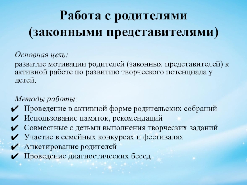 мотивации родителей (законных представителей) к активной работе по развитию творческого потенциала у детей.
