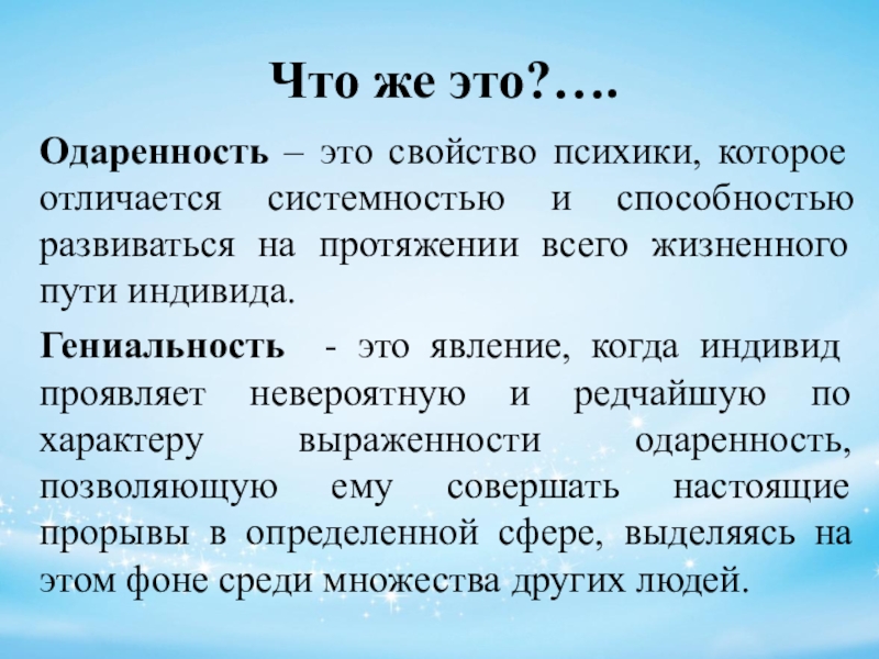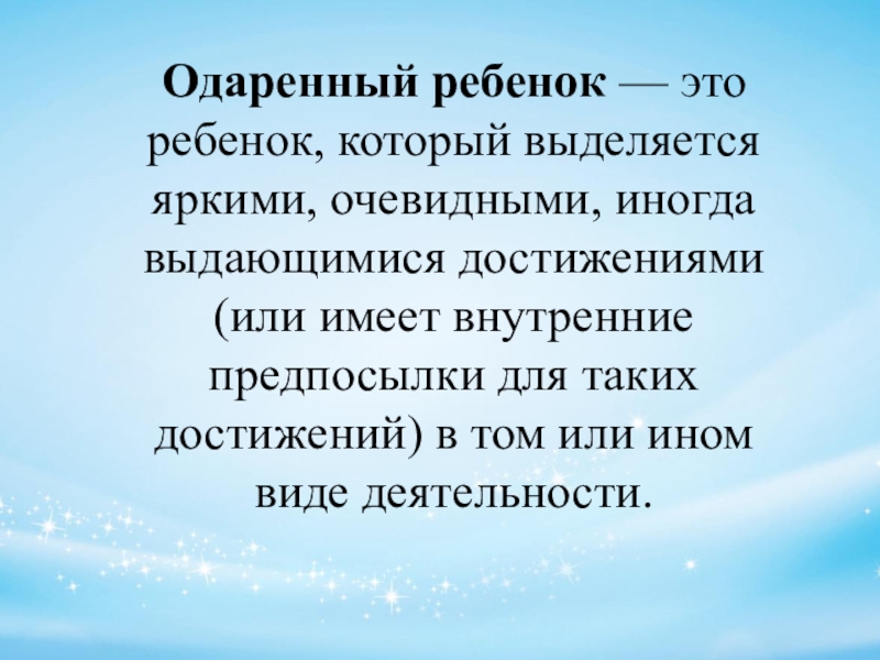 Слайд 8Одаренный ребенок — это ребенок, который выделяется яркими, очевидными, иногда выдающимися