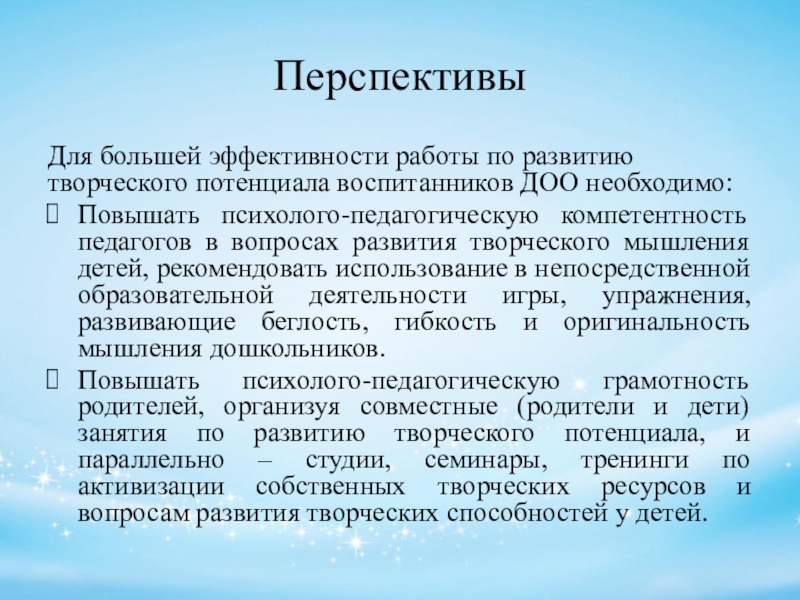 Повышать психолого-педагогическую грамотность родителей, организуя совместные (родители и дети) занятия по развитию творческого потенциала, и параллельно – студии, семинары, тренинги по активизации собственных творческих ресурсов и вопросам развития творческих способностей у детей.