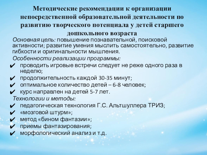 Слайд 23Методические рекомендации к организации непосредственной образовательной деятельности по развитию творческого потенциала