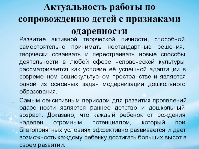 Самым сенситивным периодом для развития проявлений одаренности является раннее детство и дошкольный возраст. Доказано, что каждый ребенок от рождения наделен огромным потенциалом, который при благоприятных условиях эффективно развивается и дает возможность каждому ребенку достигать больших высот в своем развитии.