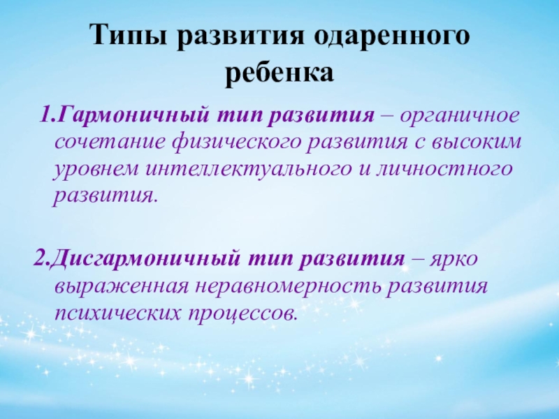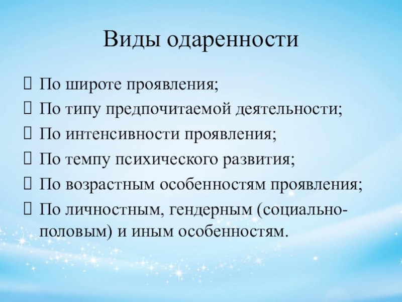 Своеобразие, качество, степень и уникальность проявления развивающейся одаренности являются