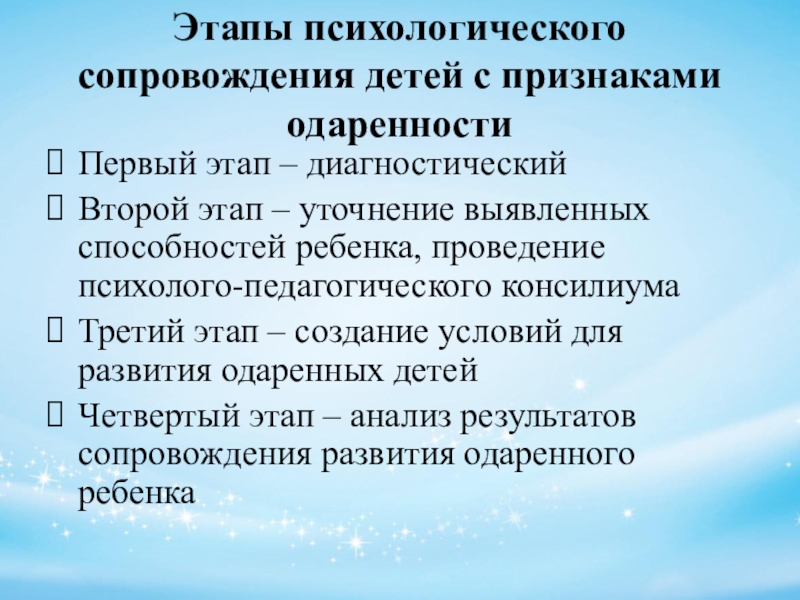 Слайд 21Этапы психологического сопровождения детей с признаками одаренности