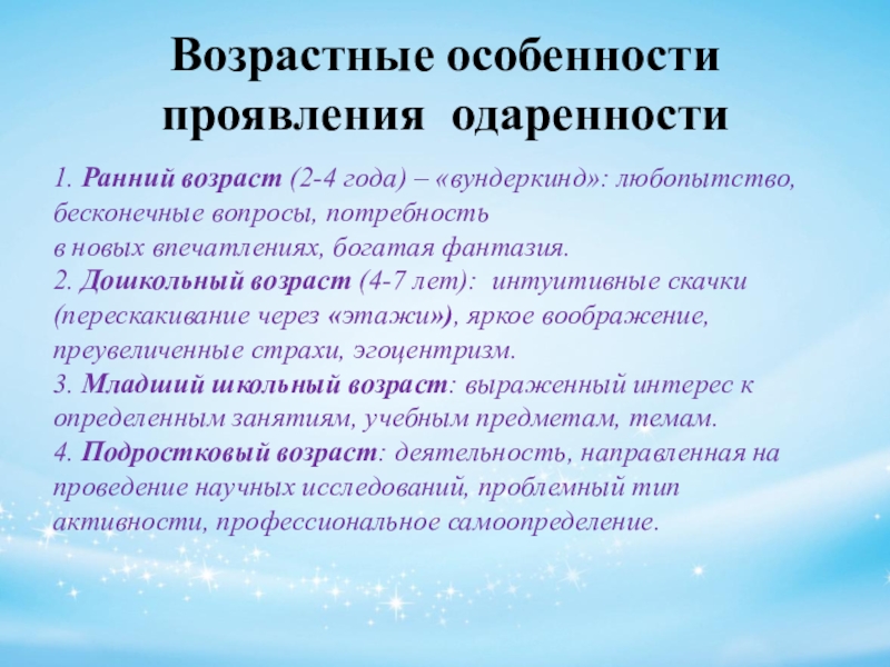 1. Ранний возраст (2-4 года) – «вундеркинд»: любопытство, бесконечные
