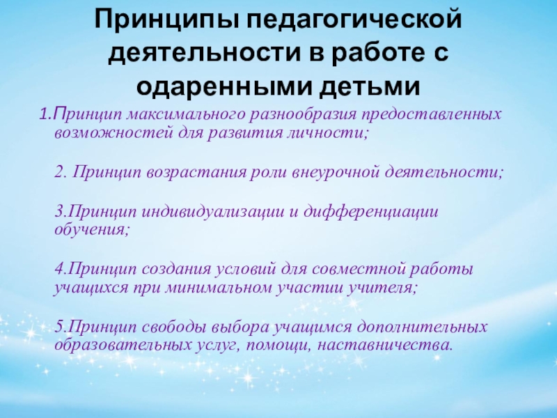 Слайд 18Принципы педагогической деятельности в работе с одаренными детьми