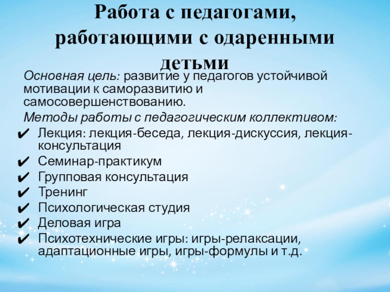 Слайд 24Работа с педагогами, работающими с одаренными детьми