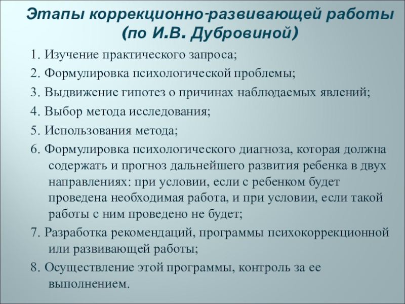 7. Разработка рекомендаций, программы психокоррекционной или развивающей работы;