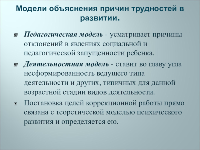 Слайд 18Модели объяснения причин трудностей в развитии.
