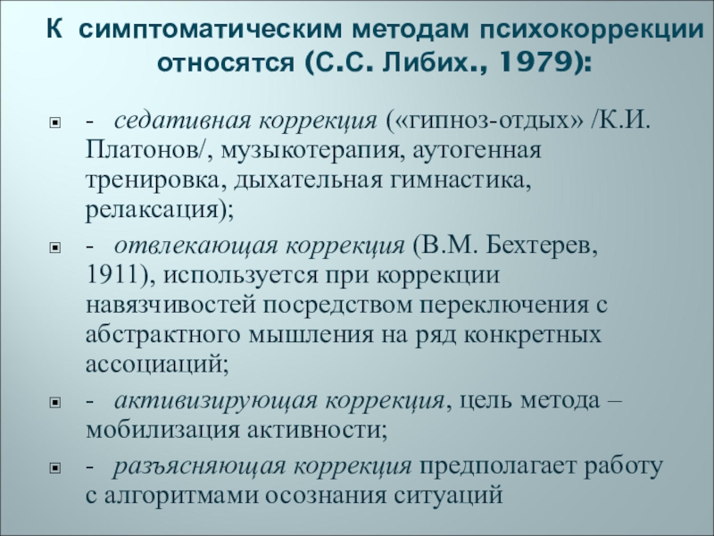 Слайд 8К симптоматическим методам психокоррекции относятся (С.С. Либих., 1979):
