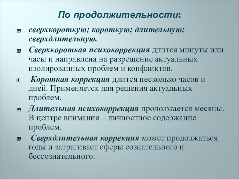Длительная психокоррекция продолжается месяцы. В центре внимания – личностное содержание проблем.