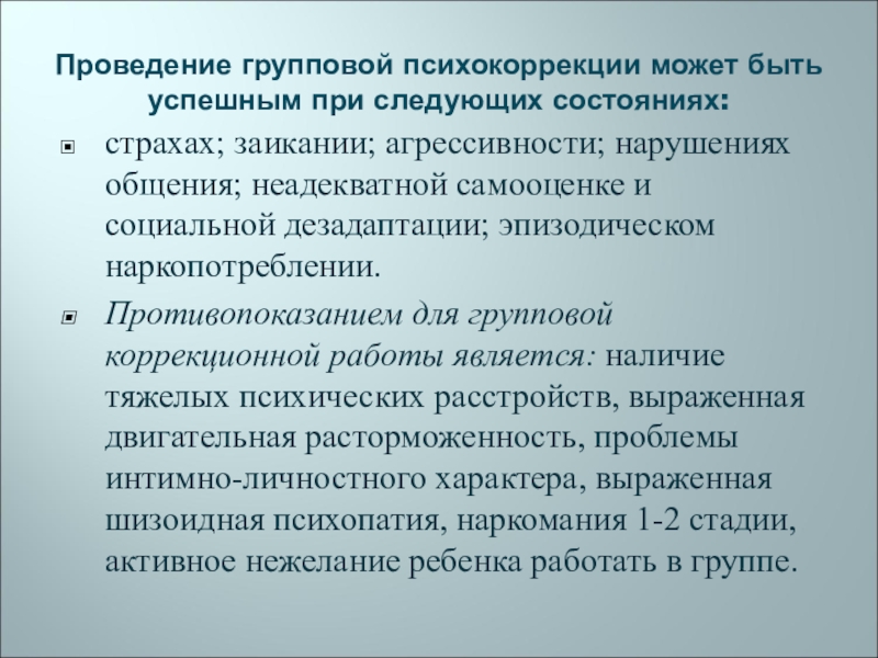 Слайд 12Проведение групповой психокоррекции может быть успешным при следующих состояниях: