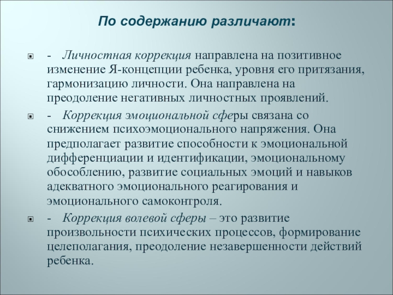 - Личностная коррекция направлена на позитивное изменение Я-концепции ребенка,