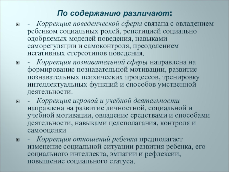 - Коррекция поведенческой сферы связана с овладением ребенком социальных