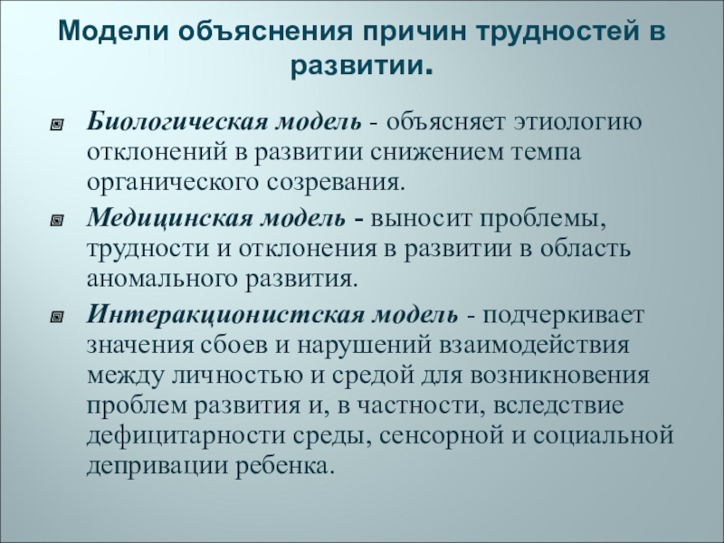Слайд 19Модели объяснения причин трудностей в развитии.