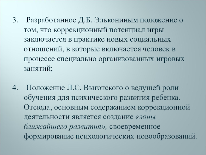 4. Положение Л.С. Выготского о ведущей роли обучения для психического развития ребенка. Отсюда, основным содержанием коррекционной деятельности является создание «зоны ближайшего развития», своевременное формирование психологических новообразований.