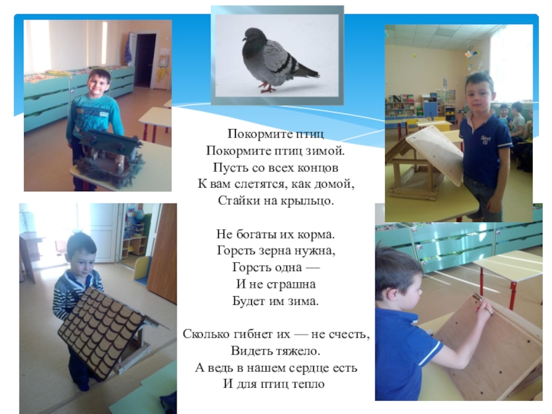 Зима – замечательное время года веселое. Можно играть в снежки, кататься на коньках. Но зима очень холодное время года, поэтому надо заботиться о птицах. Ведь им сложно найти еду и нам надо их кормить.