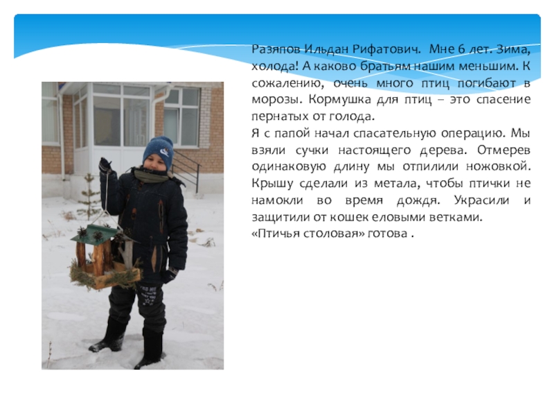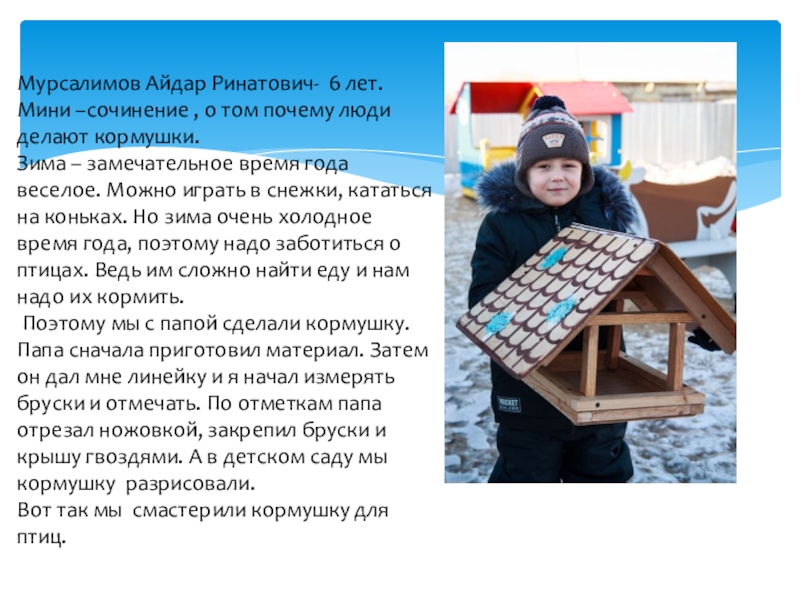 Мурсалимов Айдар Ринатович- 6 лет. Мини –сочинение , о том почему люди делают кормушки.