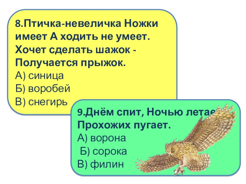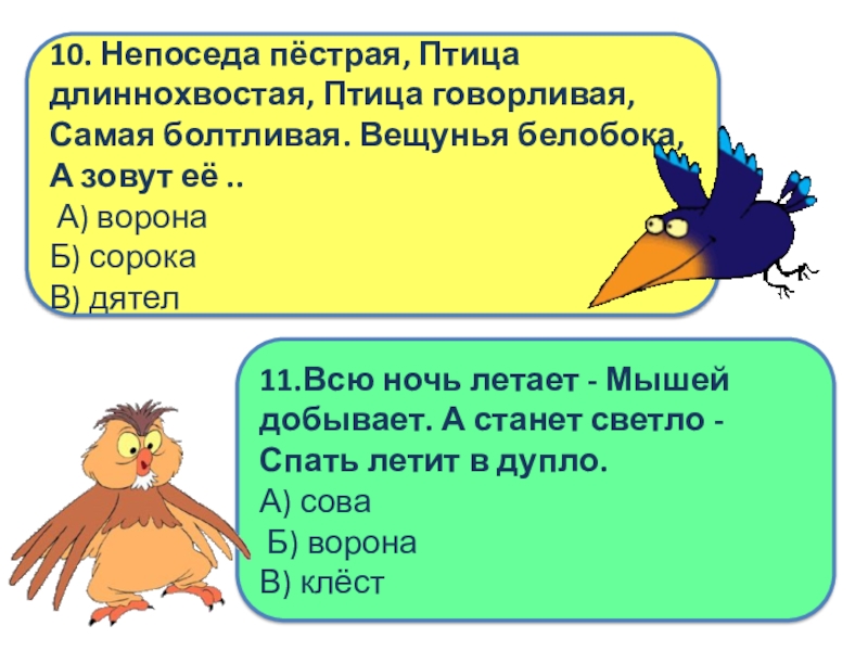 11.Всю ночь летает - Мышей добывает. А станет светло - Спать летит в дупло.